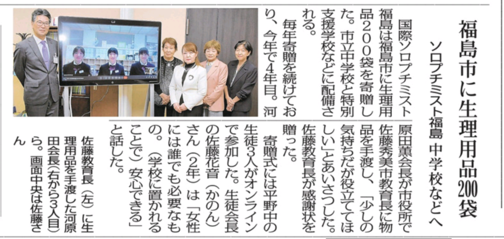 2023年から年3回生理用品を市内の学校に贈っています。女性と女児の健康のため、少しでも役に立ってほしいと願っています。配布先も中学校、特別支援学校、小学校などに広がっています。(新聞クローバー)